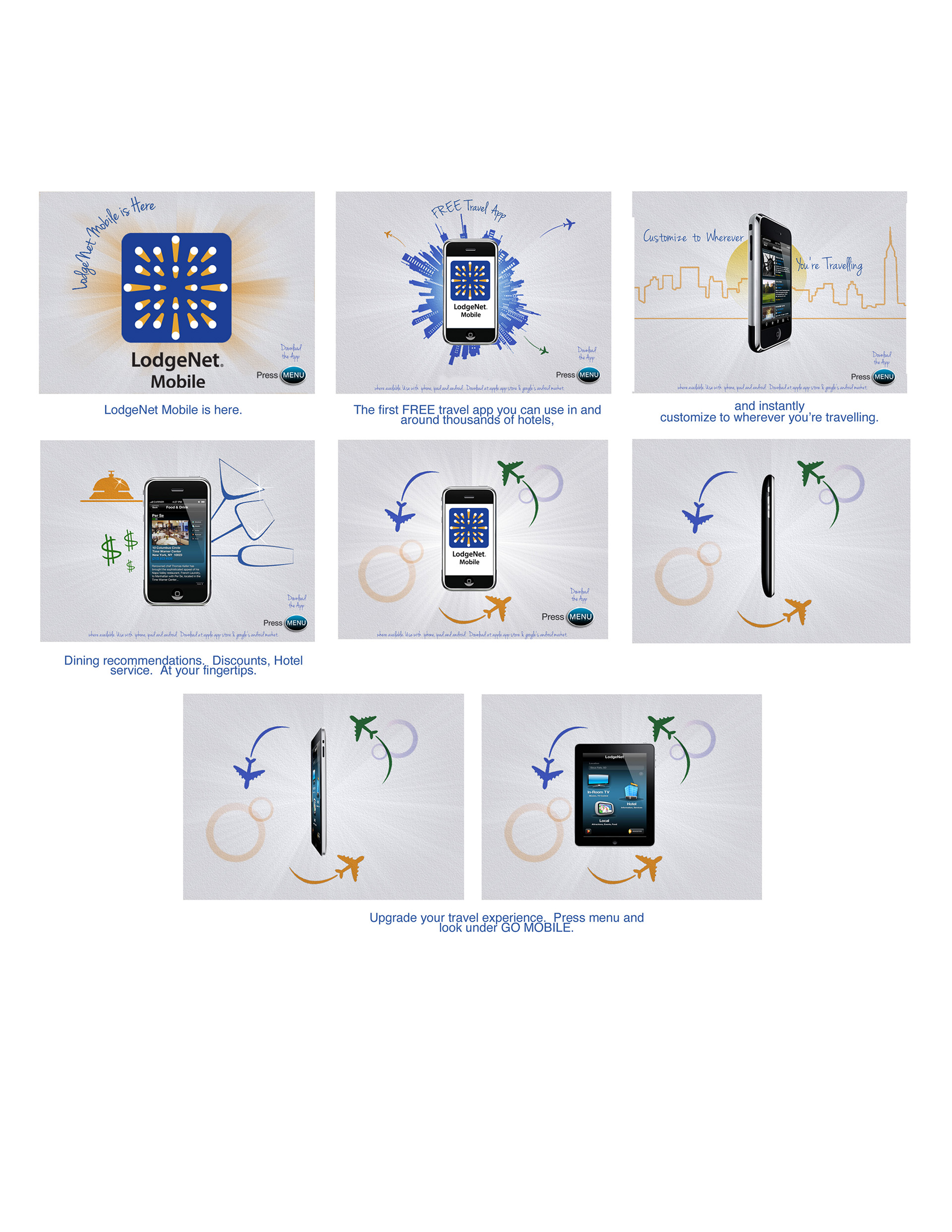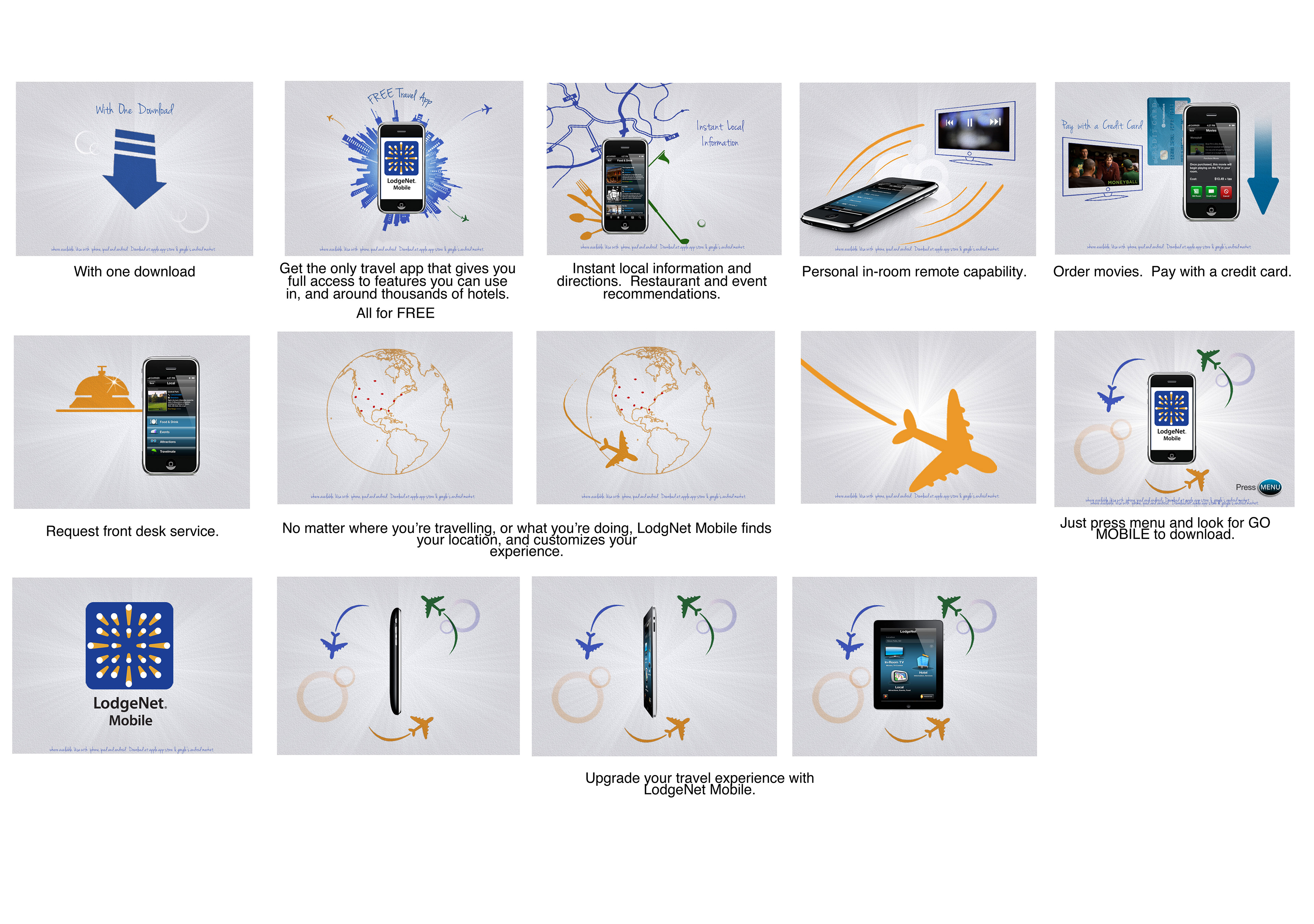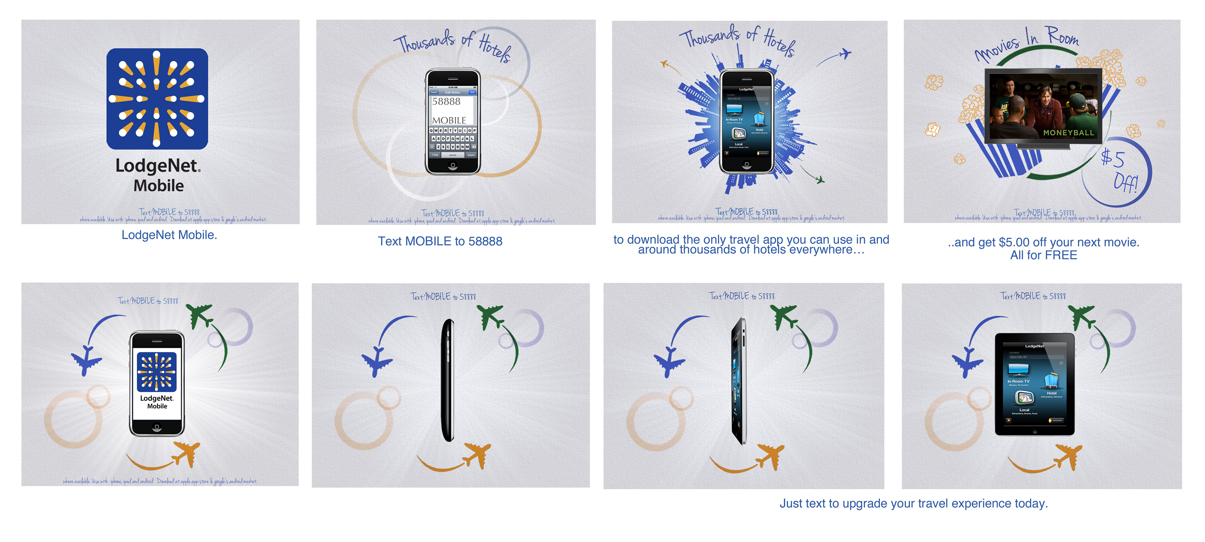 Designed graphics and boards for three 15-second, one 30-second and one 2-minute spot for the download now campaign for LodgeNet Mobile.