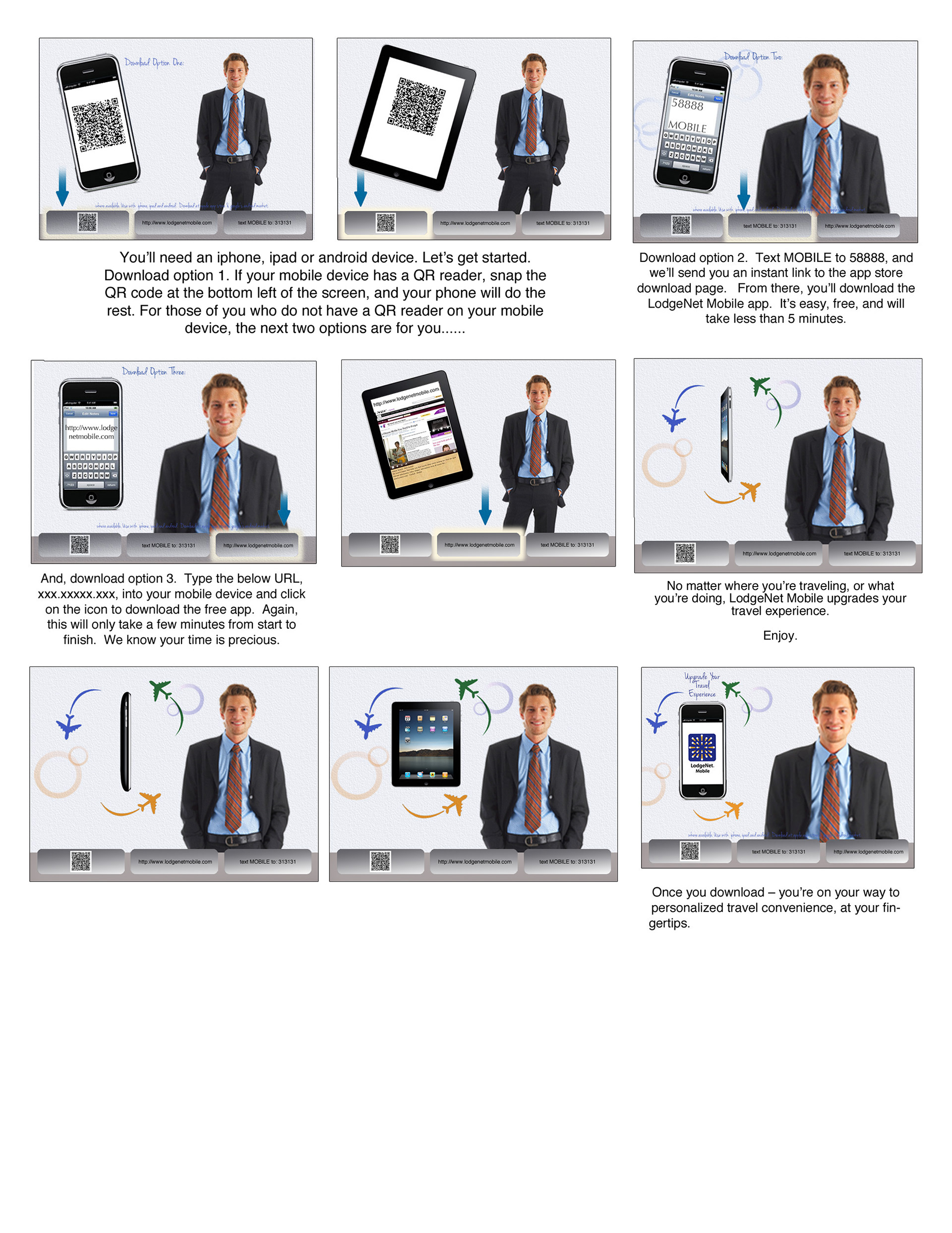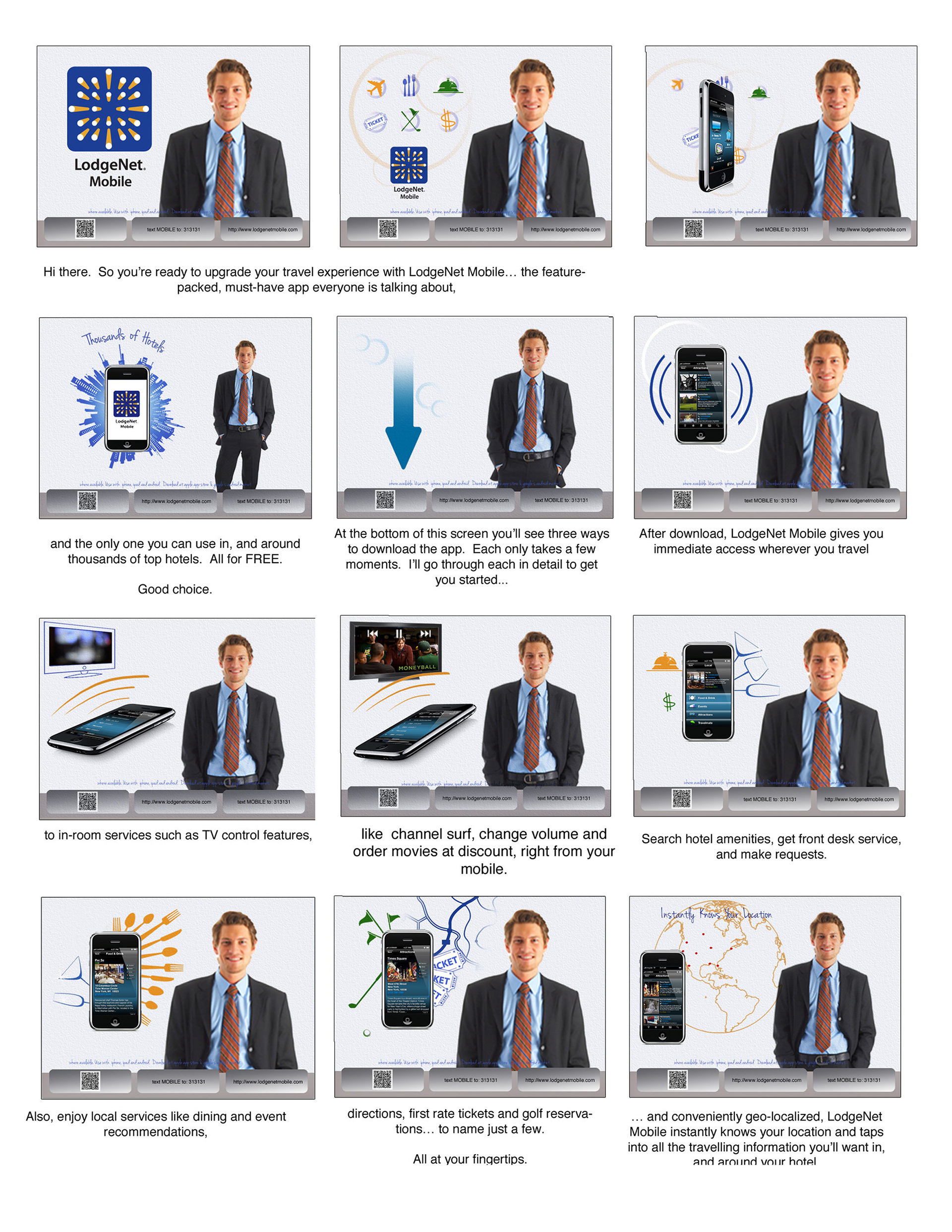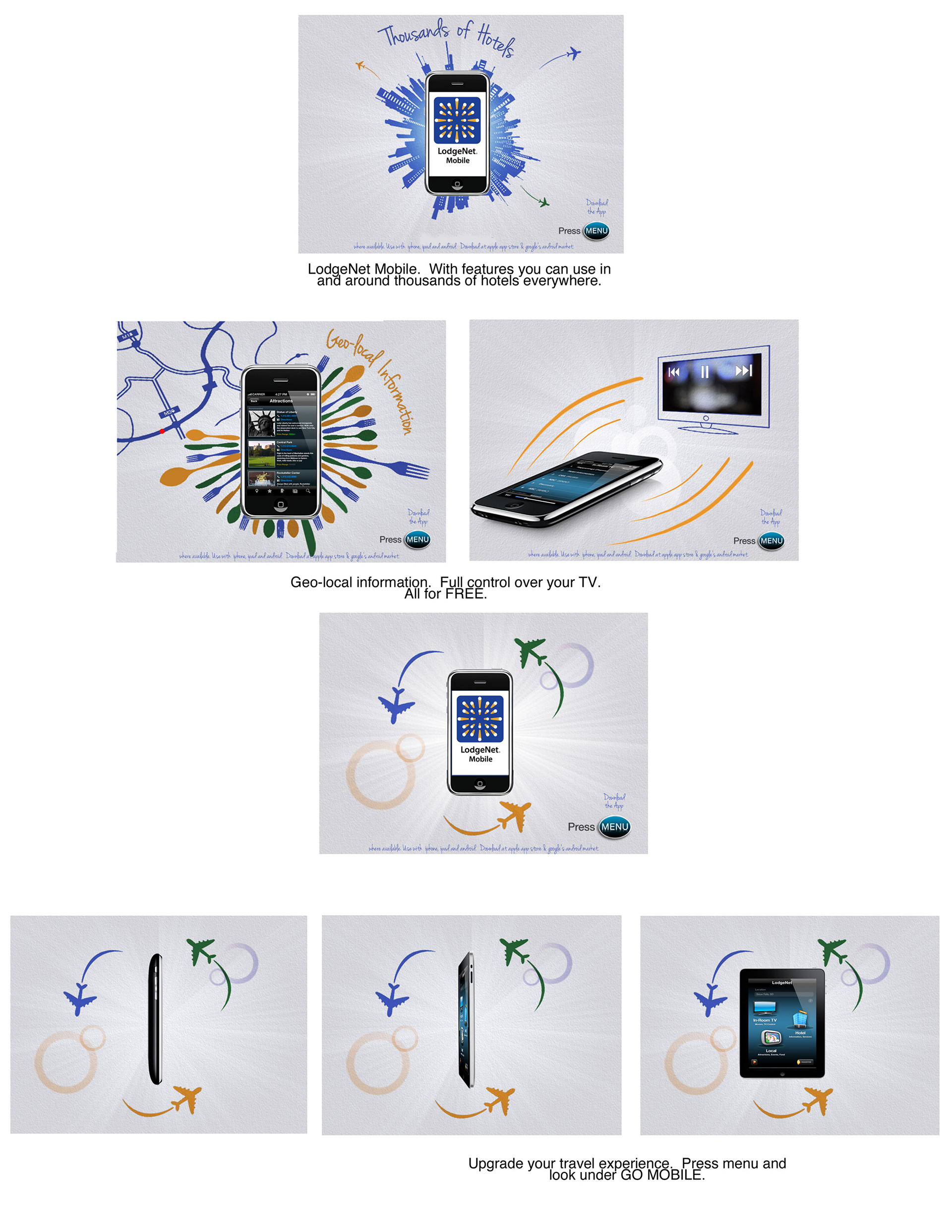 Designed graphics and boards for three 15-second, one 30-second and one 2-minute spot for the download now campaign for LodgeNet Mobile.